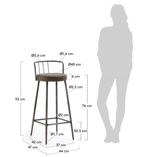 Description The Tivan stool is tall, specifically measuring 92cm. A very modern design that offers a suitably elevated position. This piece features an elegant seat upholstered in aged brown faux leather, which is very easy to clean. Materials: Synthetic leather, Foam, E0 low-emission plywood, Steel SKU: CC0749UE11 Read more less Specifications Condition: Very good (VG)